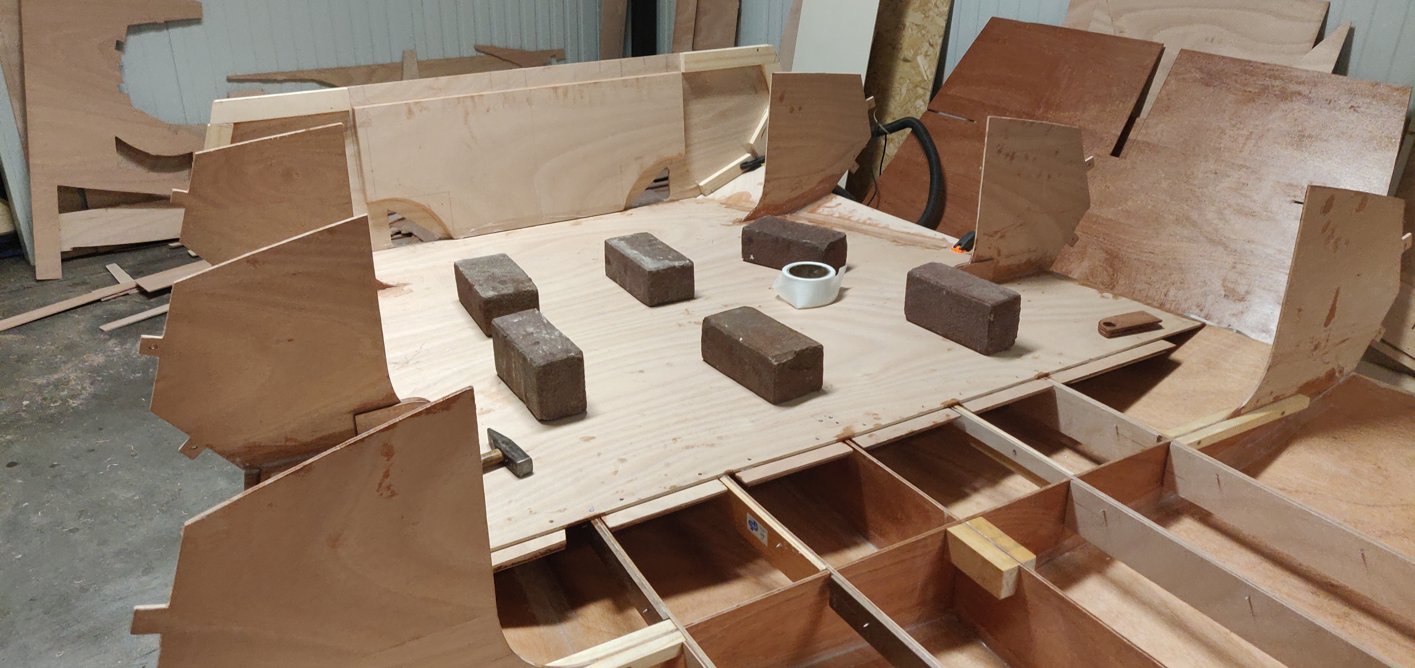 Om de vloerdelen te verbinden heb ik 1 kant voorzien van lipjes zodat het andere deel er tegenaan geschroefd kan worden. Klemmen is niet mogelijk dus heb ik gelijmd met een combinatie van schroeven en gewicht. Tussentijds ook de mastkoker vastgelijmd en de ribjes voor het dek geschaafd.